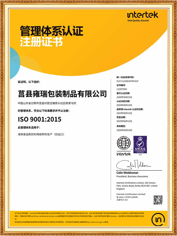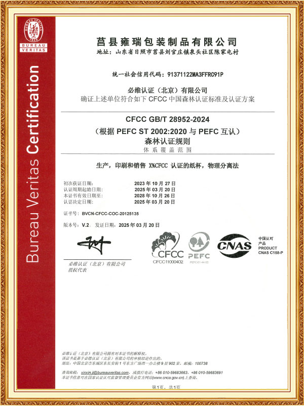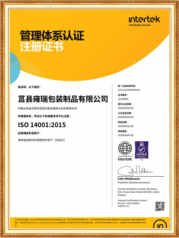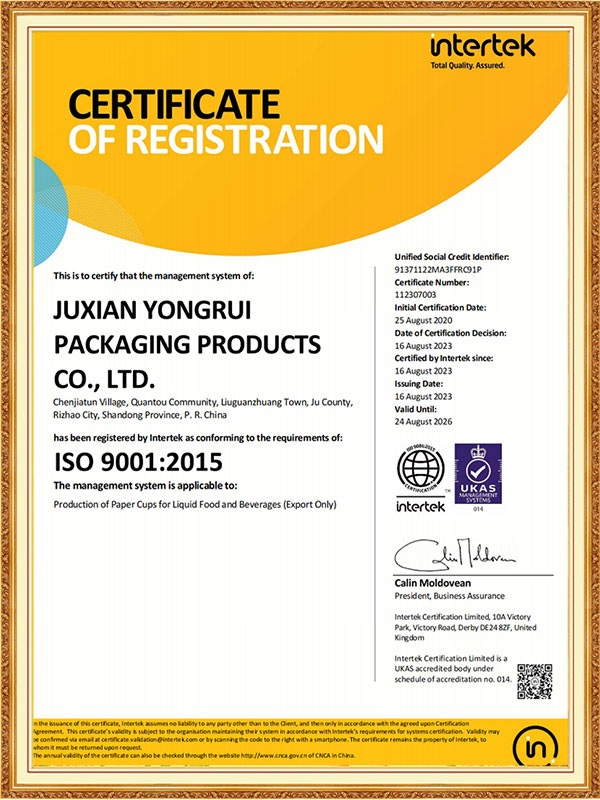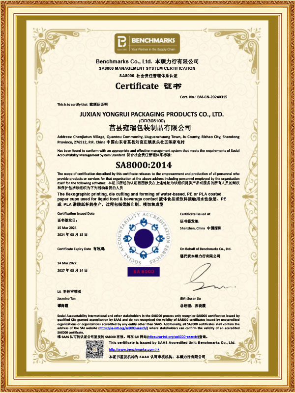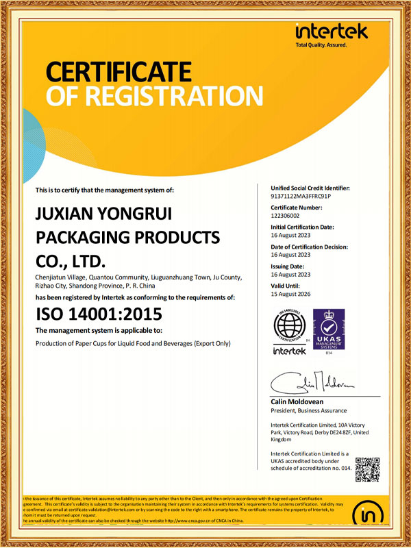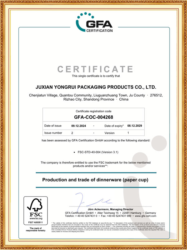 Untuk memenuhi piawaian antarabangsa yang ketat, produk kami memegang pensijilan termasuk ISO 9001, ISO 14001, FSC, BRC, dan DIN dll. Selanjutnya Yongrui Packaging sedang membangunkan cawan kertas yang diperbuat daripada bahan mentah FSC dan EUDR, dengan tegas dan tidak berbelah bahagi memimpin industri pembungkusan ke arah pembangunan mampan. Kami menawarkan perkhidmatan "satu henti" penuh, dari reka bentuk hingga selepas jualan, pasukan kami sedia membantu 24/7. Sementara itu, perkhidmatan OEM & ODM tersedia untuk membantu anda membina jenama anda.